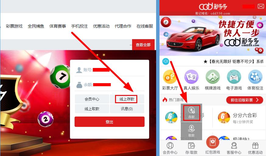 手机用户:进入彩多多官网,登入会员账号后,点击【存/取款】→【存款】。