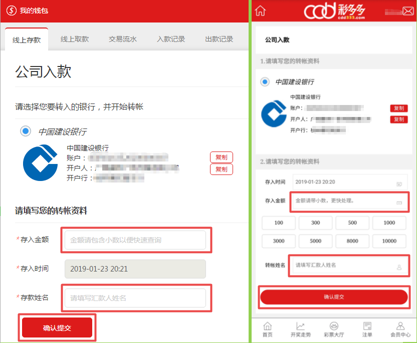 手机用户:选择并记录好公司指定入款账号进行转账汇款后,根据页面提示填写真实转账资料,点击提交即可。只要您的银行卡有扣款成功,财务人员查收到您的款项并核对您的存款数据无误后,将在3分钟内为您添加额度。